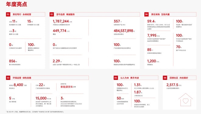 報告由“責(zé)任篤行、永續(xù)經(jīng)營”和“環(huán)保運營,綠色發(fā)展”等6個主題,以及“企業(yè)治理”“食品質(zhì)量與安全”“堅持可持續(xù)采購”“社會公益”等17個議題構(gòu)成。