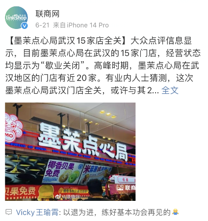 6月21日,聯(lián)商網微博發(fā)布消息,目前墨茉點心局在武漢的15家門店,經營狀態(tài)均顯示為“歇業(yè)關閉”。高峰時期,墨茉點心局在武漢地區(qū)的門店有近20家。墨茉點心局創(chuàng)始人王瑜霄在微博下的評論是“以退為進,練好基本功會再見”。