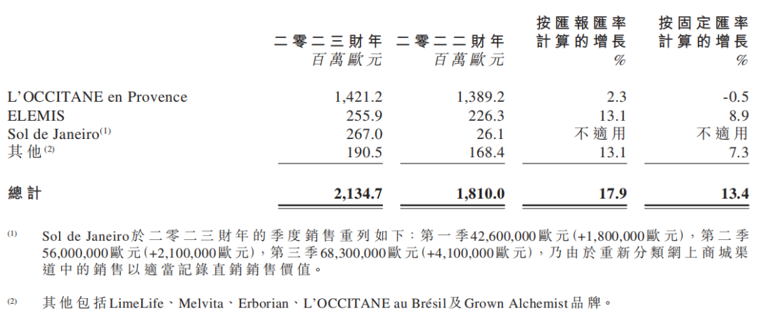 就財報情況來看,收購策略已為歐舒丹創(chuàng)造了不錯的營收,尤其是ELEMIS和Sol de Janeiro表現(xiàn)優(yōu)異,2023財年銷售凈額共占全集團的24.5%,僅次于自有品牌L’OCCITANE en Provence。其中,Sol de Janeiro在被收購兩年后,有了超出管理層預期的表現(xiàn),2023財年銷售額增長一倍多,以當地貨幣計算增長135.2%,成為本集團第二大品牌,銷售額達到2.67億歐元。從這一數據看,若Sol de Janeiro在中國市場運作得當,有望給全盤帶來新的氣象。