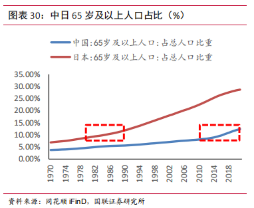 2000年,中國65歲以上人口占比從6.81%增長到2021年的12.41%;日本的老齡化人口呈現(xiàn)出類似的增長步伐,已經(jīng)從1970年的6.88%增長到1991年的12.31%。