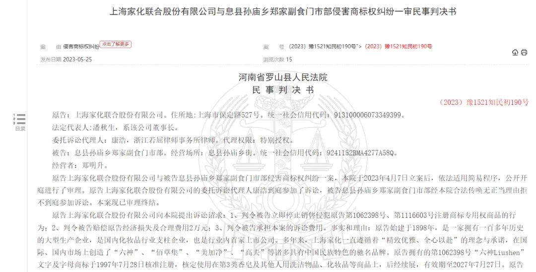 比如,近日,上海家化與息縣孫廟鄉(xiāng)鄭家副食門市部侵害商標(biāo)權(quán)糾紛民事一審判決書公布。