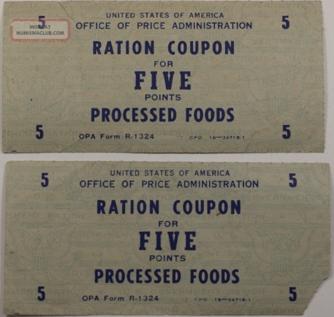 許多零售商幫助顧客應(yīng)對配給制的不便,提供“無需配給點(diǎn)”的肉類替代方案。“無需配給點(diǎn)”的產(chǎn)品包括豆類、谷類和面食。美國民眾購買商品時(shí)需要使用物資配給簿中的“券”,憑券購買配給食品。OPA根據(jù)每種食品可獲得難易度為其分配一定數(shù)量的點(diǎn)數(shù),顧客每月可以使用48個(gè)“藍(lán)點(diǎn)”購買罐裝或者瓶裝的加工食品或干雜食品,使用64個(gè)“紅點(diǎn)”購買肉類、魚類和乳制品——如果這些商品在市場上有庫存的話。