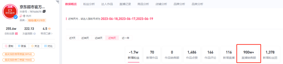 當(dāng)然,有著6億日活流量的抖音超市也有后來居上的可能性。要知道,就連京東超市也選擇了抖音作為帶貨主陣地之一,目前,京東超市在抖音建立了多個(gè)直播間矩陣,其中“京東超市官方旗艦店”近90天的帶貨GMV接近千萬。