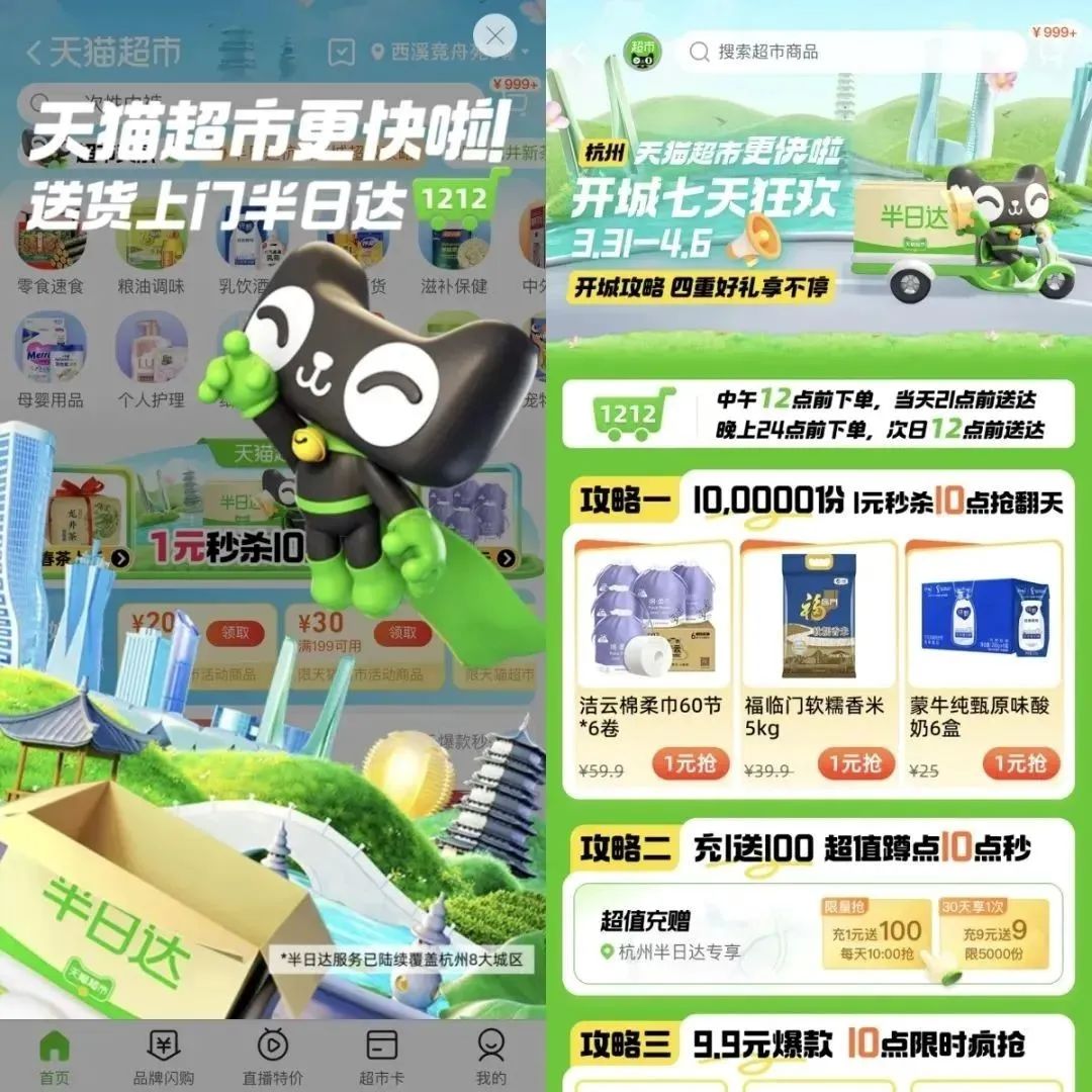3月31日,天貓超市正式在杭州啟動(dòng)半日達(dá)服務(wù),消費(fèi)者在天貓超市下單后,可以享受“上午買下午到”、“晚上買早上到”的極速送達(dá)和送貨上門服務(wù)。