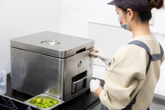 圖:喜茶店員使用自動去皮機制備青提鮮果