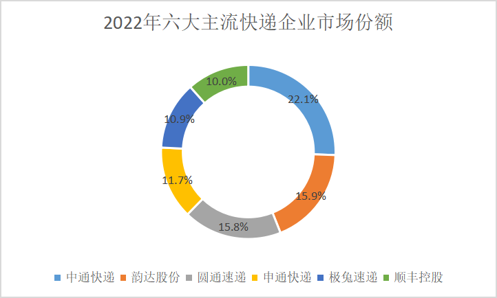 2022年六大主流快遞企業(yè)市場(chǎng)份額(按業(yè)務(wù)量),數(shù)據(jù)來源/企業(yè)年報(bào),一刻商業(yè)制圖