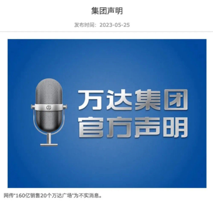 5月25日,萬達集團在官網發(fā)布聲明稱,網傳160億銷售20個萬達廣場為不實消息。