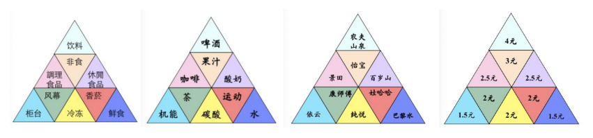 如下圖所示,門店的業(yè)績是由貨架業(yè)績所決定,而貨架業(yè)績是由各品類加總而成,各品類的業(yè)績就是由“單品+單品”,而單品又可以細分不同的規(guī)格(價格帶)。