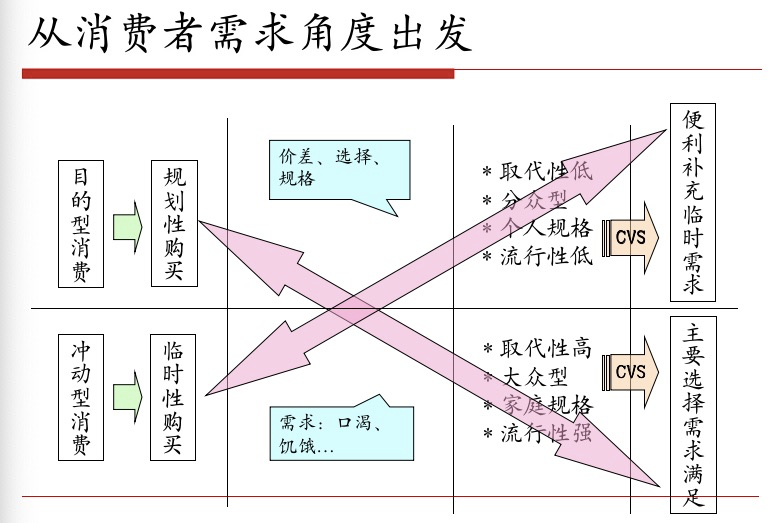 便利店消費者通常分為“沖動型”購買及“目的型”購買兩大類,前者代表著臨時性購買,主要是滿足需求,而后者則是規(guī)劃性購買,主要是補充需求。兩者商品的特性及考慮的方向不同,這是做品類管理時必須考慮的因素。