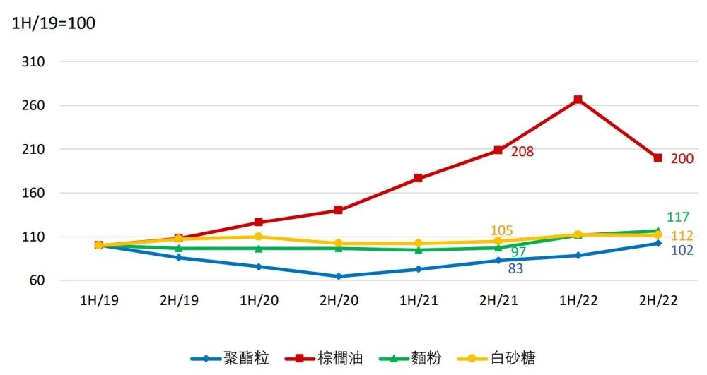這與原材料價(jià)格上漲引發(fā)康師傅的成本上漲有關(guān)。財(cái)報(bào)顯示,過去幾年,康師傅的主要采購(gòu)原材料包括聚酯粒、棕櫚油、面粉等,價(jià)格均呈上漲態(tài)勢(shì)。2022年6月,棕櫚油的價(jià)格相較于三年前就上漲了2.5倍。