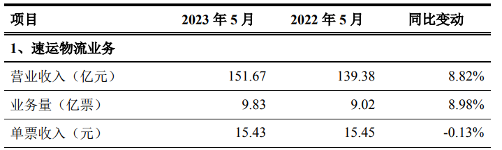 數(shù)據(jù)顯示,2023年5月,順豐營業(yè)收入201.60億元,其中,速運(yùn)物流業(yè)務(wù)收入為151.67億元,同比增長8.82%,業(yè)務(wù)量為9.83億票,同比上升8.98%。