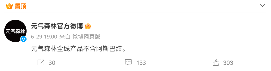 元?dú)馍衷谄涔俜轿⒉┌l(fā)布消息稱:“元?dú)馍秩產(chǎn)品不含阿斯巴甜!蹦窝┑牟柘嚓P(guān)負(fù)責(zé)人則對(duì)外表示,2022年11月,奈雪的茶已經(jīng)宣布全部產(chǎn)品使用升級(jí)的天然代糖“羅漢果糖”。