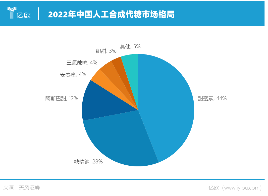 天風(fēng)證券的研究報(bào)告顯示,截至2022年,人工合成代糖在中國代糖的市場份額為52.38%,是應(yīng)用最多的代糖;天然代糖和糖醇類代糖的市場份額分別為29.41%和18.21%,擁有很大的增長空間。