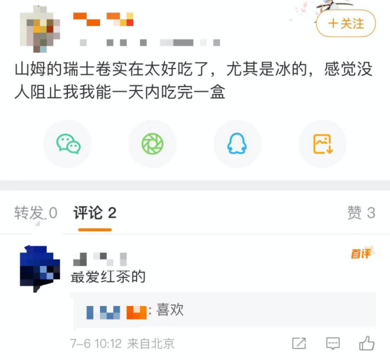 例如在微博上,有網(wǎng)友推薦了山姆這款瑞士卷。
