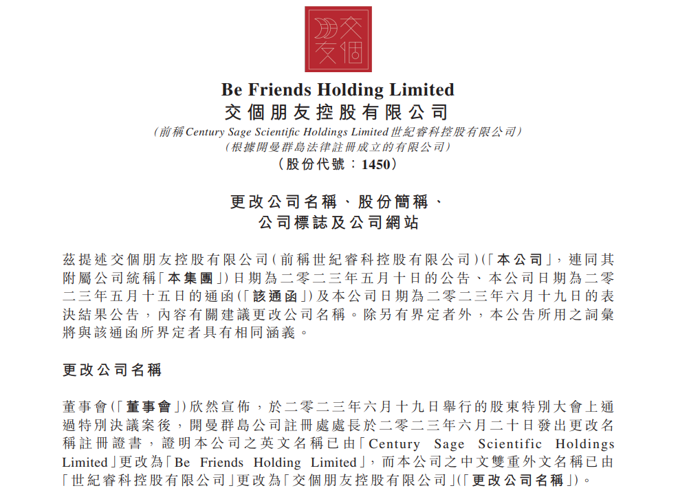 日前,港交所上市公司世紀(jì)?瓶毓捎邢薰荆ㄏ路Q:世紀(jì)?疲┌l(fā)布公告,該公司將于7月11日上午9時(shí)起,正式更名為“交個(gè)朋友控股”,公司的股票代碼則維持不變。