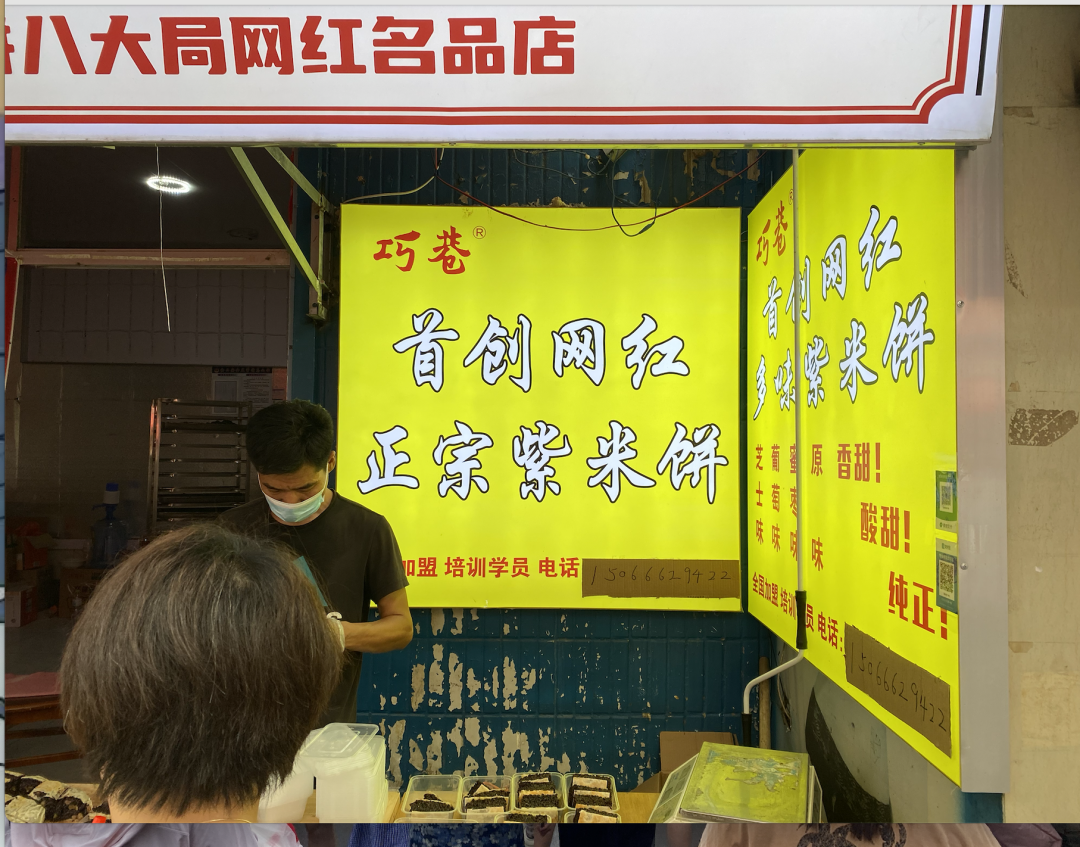 原本不長的市場因涌入過多游客,水泄不通。肥腸包、炒鍋餅、紫米餅、炸肉……小吃在市場內(nèi)無限循環(huán)著,每家都標注著正宗、網(wǎng)紅與首創(chuàng)。