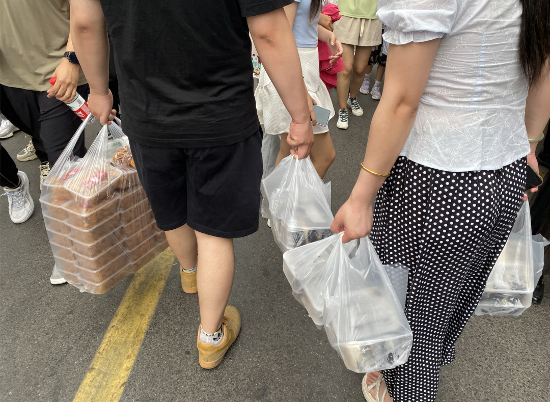 來自張家港的張大哥和媳婦拎著幾大袋紫米餅和其他小吃,匆匆走出市場,說要帶回去給朋友們嘗嘗。