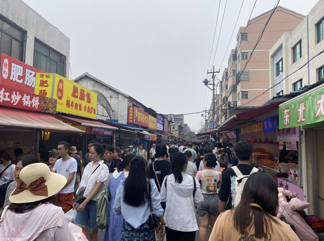 穿過洶涌的人潮來到市場門口,人潮依舊洶涌,“八大局便民市場”的樸素招牌,成了無數(shù)人的拍照背景。