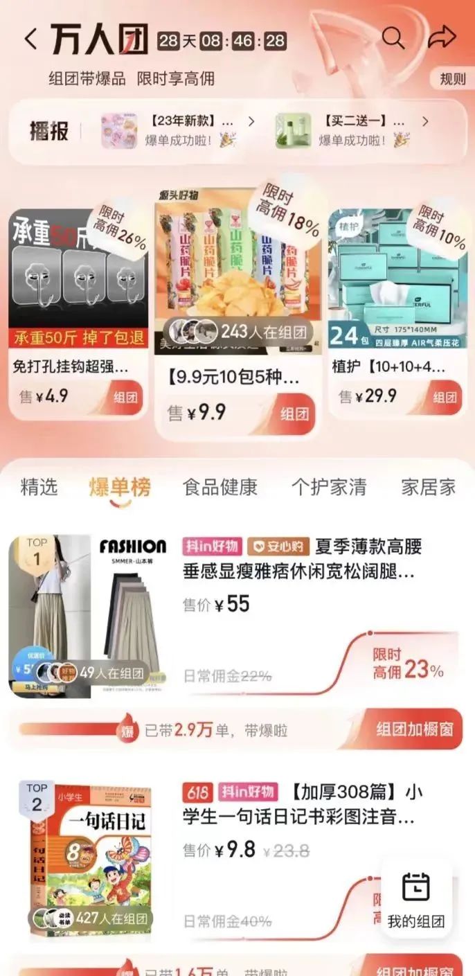 如果說拼多多的拼團(tuán)是“拼得多,省得多”,那么抖音的萬人團(tuán)則是“拼得多,賺得多”,同一商品的帶貨達(dá)人越多,傭金分成也越高。