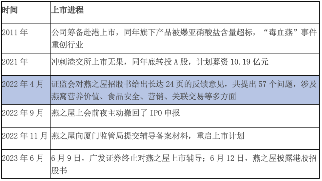 2011年,燕之屋產(chǎn)品爆出亞硝酸鹽含量超標(biāo)的“毒血燕”事件,致使首次IPO計劃擱淺。此后數(shù)年間,燕之屋在A股與港股之間反復(fù)橫跳。