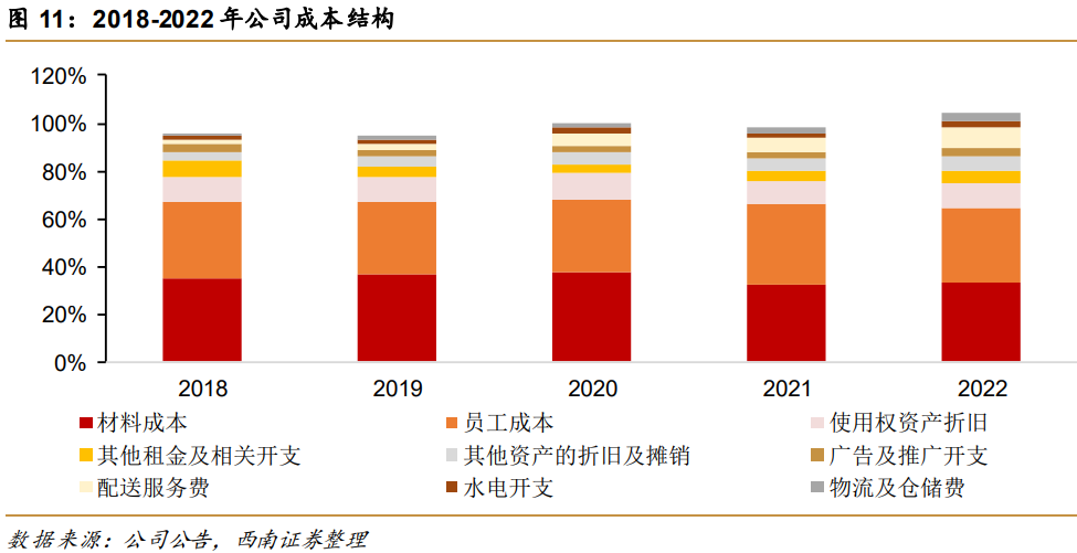 但門店數(shù)量增長需要需要充足的人力、物力提供現(xiàn)實基礎(chǔ)。為維持拓店節(jié)奏,奈雪投入成本也在不斷抬升。其中,材料、租金、員工成本從7.97億元提高至30.07億元,占總營收比例始終穩(wěn)定在70%以上。加之使用權(quán)資產(chǎn)折舊、廣告及推廣、配送服務(wù)費等開支,奈雪長期處于入不敷出的狀態(tài)中。