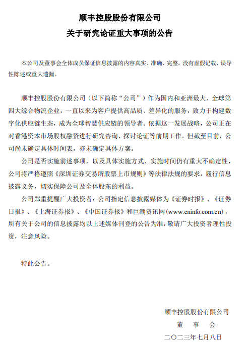 同日,順豐控股還發(fā)布了《關(guān)于研究論證重大事項(xiàng)的公告》,回應(yīng)了赴港二次上市的消息。