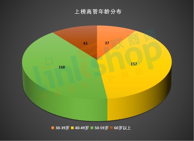 榜單中,各年齡階段上榜人數(shù)如下:30-39歲之間上榜37人,占比9.1%;40-49歲之間上榜157人,占比38.8%;50-59歲之間上榜168人,占比41.5%;60歲以上上榜43人,占比10.6%。