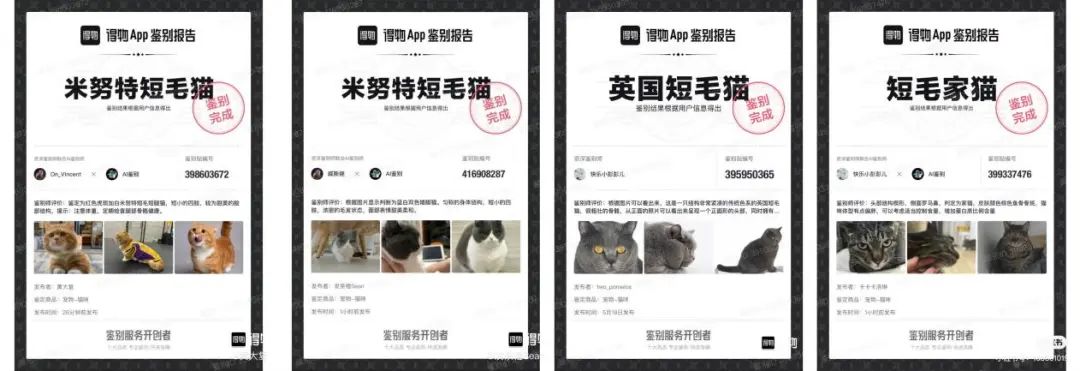 最近在得物,你一定被這樣一份特殊的“鑒別報(bào)告”刷過(guò)屏:被鑒定的主角并非球鞋與潮服,報(bào)告上方也沒(méi)有碩大的“真”與“假”標(biāo)識(shí);蚺只蚴、或甜美可愛(ài)或憨態(tài)可掬的貓咪們是這份鑒定報(bào)告中的絕對(duì)主角,鑒定師們用專業(yè)的術(shù)語(yǔ),為形態(tài)各異的貓咪們,奉上一份頗具儀式感的鑒定報(bào)告。