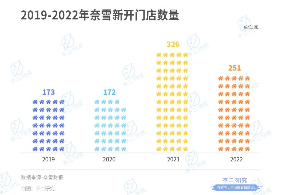 2022年,奈雪第一類茶飲店新增178家,第二類茶飲店新增73家,全年凈新增251家門店。