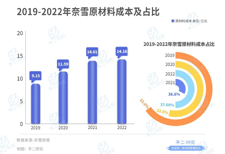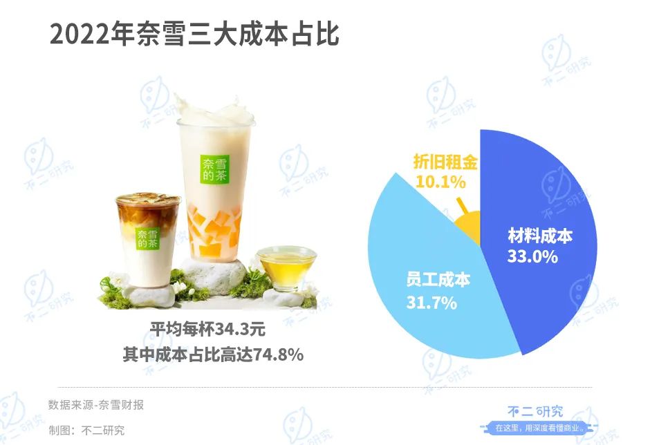 雖然售價達到平均每杯34.3元,但其中成本占比高達74.8%!覆欢芯俊拱l(fā)現(xiàn):奈雪最大三項支出為原材料、人工和折舊租金,分別占2022年收入比重的33.0%,31.7%和10.1%。