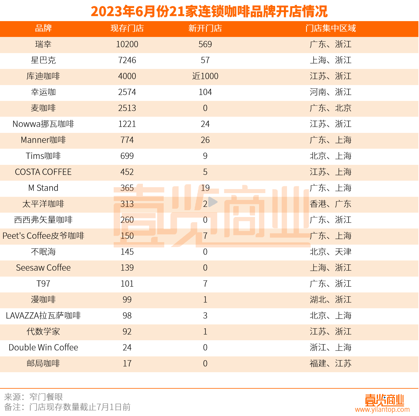 6月份,壹覽商業(yè)長期跟蹤觀察的國內(nèi)21家連鎖咖啡品牌新開門店與上月相比增加869家。