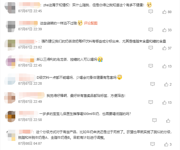 不過(guò),這項(xiàng)制度僅以糖分和飽和脂肪含量作為評(píng)估標(biāo)準(zhǔn),并未納入蛋白質(zhì)、礦物質(zhì)等其他營(yíng)養(yǎng)成分。有網(wǎng)友發(fā)現(xiàn),市面上部分純奶產(chǎn)品的營(yíng)養(yǎng)等級(jí)竟然低于果汁、汽水,也引發(fā)一些質(zhì)疑。有網(wǎng)友指出,該分級(jí)制度確實(shí)有助于篩選產(chǎn)品,但針對(duì)不同品類的產(chǎn)品,還需要進(jìn)一步優(yōu)化分級(jí)方式。