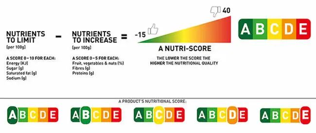 在歐洲大陸市場(chǎng),Nutri -Score標(biāo)簽是使用較為普遍的營(yíng)養(yǎng)評(píng)級(jí)標(biāo)簽。Nutri -Score是一種五色營(yíng)養(yǎng)標(biāo)簽,基于英國(guó)食品標(biāo)準(zhǔn)局(FSA)創(chuàng)建的FSA營(yíng)養(yǎng)評(píng)分,通過(guò)將不同營(yíng)養(yǎng)成分進(jìn)行賦分和計(jì)算,最后得出產(chǎn)品分?jǐn)?shù)對(duì)應(yīng)的等級(jí)。