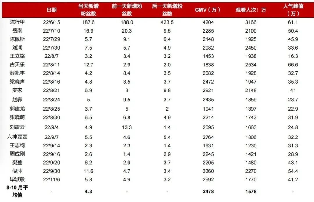 一是名人效應(yīng)的不確定性。二是用戶的審美疲勞。根據(jù)東方證券對東方甄選的數(shù)據(jù)跟蹤,去年8月至10月,正值東方甄選的爆火時期,其名人助陣所帶來的粉絲增量與場觀表現(xiàn)呈現(xiàn)明顯的波動。