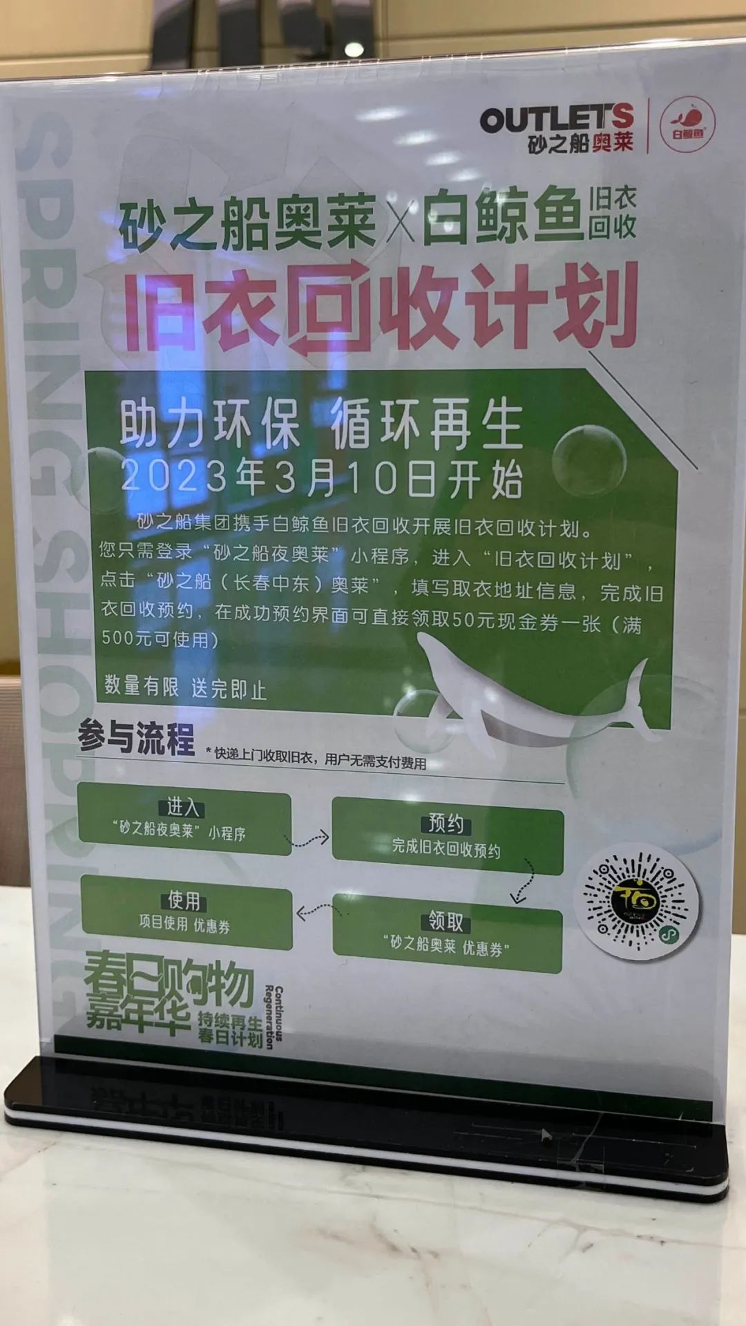 為了方便顧客參與「綠色行動(dòng)」,砂之船旗下16個(gè)項(xiàng)目開(kāi)展「掃碼上門(mén)回收」活動(dòng),參與者只需要掃碼即可預(yù)約上門(mén)回收,迅速吸引顧客、商戶(hù)參與進(jìn)來(lái)!概f衣回收」是「一件衣服」本身的持續(xù)發(fā)展,「循環(huán)利用」的背后是砂之船「生態(tài)奧萊」打造以及「可持續(xù)生活方式的思考」。