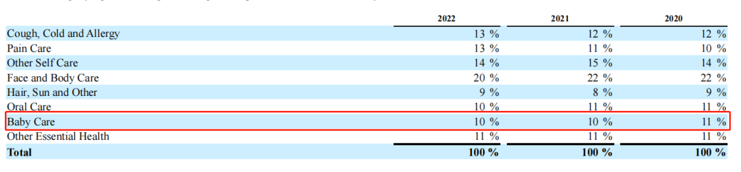 此外,就近三年來看,嬰兒護(hù)理業(yè)務(wù)占強(qiáng)生健康消費(fèi)品部門總營收的比重也在逐年下滑。據(jù)Kenvue招股書顯示,截止2022年末,嬰兒護(hù)理占總營收比重僅為10%,而在十年前該比例為15%。