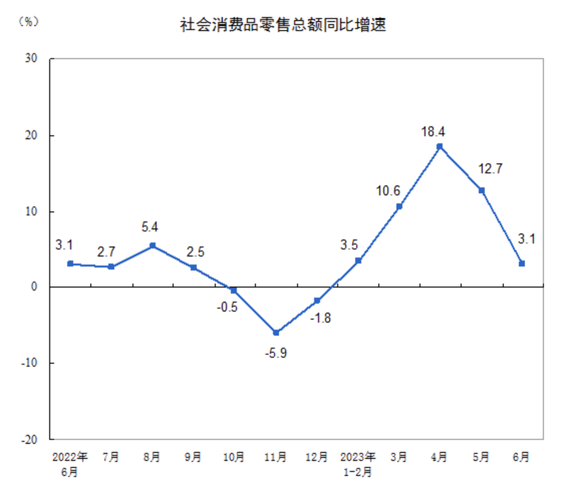 2023年上半年,社會(huì)消費(fèi)品零售總額227588億元,同比增長(zhǎng)8.2%。其中,除汽車以外的消費(fèi)品零售額205178億元,增長(zhǎng)8.3%。其中,6月份,社會(huì)消費(fèi)品零售總額39951億元,同比增長(zhǎng)3.1%。