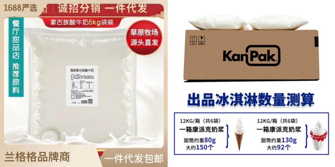 左:蘭格格蒙古族酸牛奶 右:康派克冰淇淋奶漿 圖源:1688