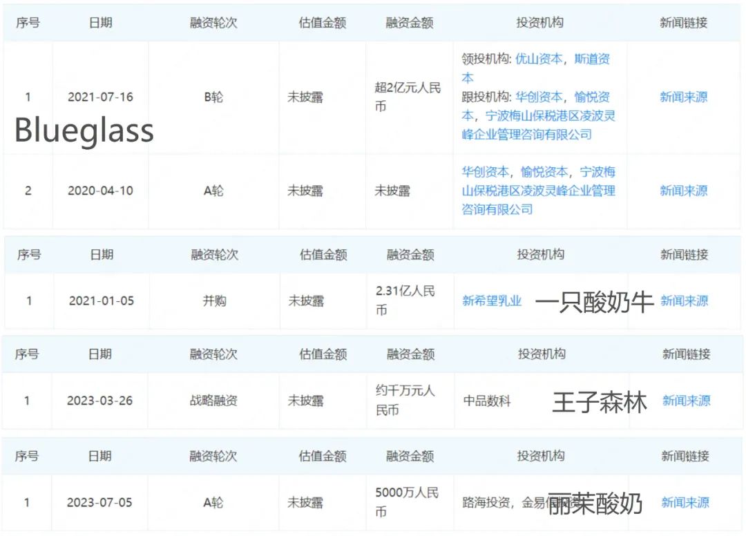 2021年,Blueglass獲得超兩億元的B輪融資,新乳業(yè)以2.31億元的價格收購了一只酸奶牛,即使是在新消費(fèi)融資沉寂的2023年,也先后有王子森林、麗茉酸奶獲得融資。