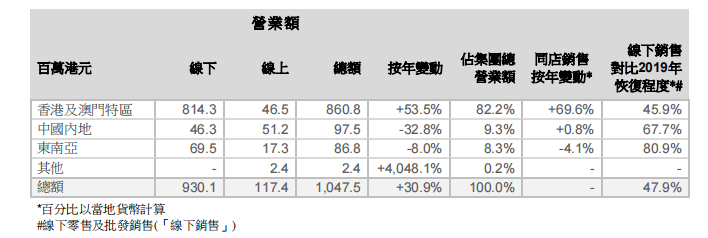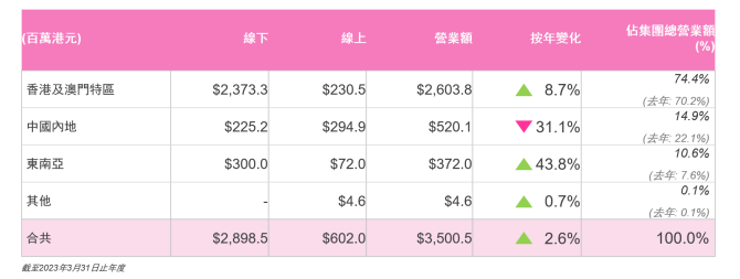 財(cái)報(bào)顯示,莎莎國(guó)際營(yíng)業(yè)額為35億港元,同比上漲2.6%;其中中國(guó)香港及澳門(mén)市場(chǎng)線下銷(xiāo)售增長(zhǎng)7.3%至23.73億港元,主要是第四季度銷(xiāo)售見(jiàn)長(zhǎng)。此外從利潤(rùn)情況看,同比上一財(cái)年錄得虧損3.44億港元,2023財(cái)年轉(zhuǎn)虧為盈,至全年溢利5824.7萬(wàn)港元。