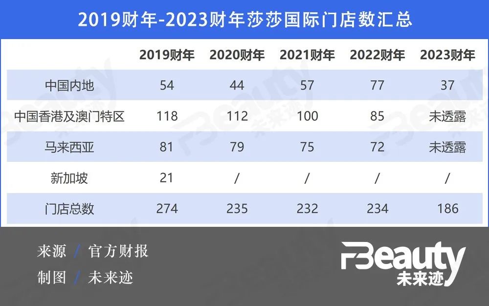 然而近些年來(lái),莎莎國(guó)際業(yè)績(jī)持續(xù)低迷,2019財(cái)年(2018年月4月1日—2019年3月31日為止)開(kāi)始,集團(tuán)陷入“關(guān)店潮”:2019財(cái)年,莎莎國(guó)際門(mén)店總數(shù)為274家;2020財(cái)年關(guān)閉新加坡市場(chǎng)所有門(mén)店;截至2023財(cái)年,莎莎國(guó)際全球門(mén)店僅剩186家,在五年時(shí)間內(nèi)陸續(xù)關(guān)閉了88家。