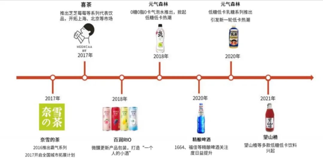 然而,隨著新股蜜月期的結束,逐漸回歸理性的投資者開始重新思考茶飲市場的變化。彼時,在消費升級的助力下,以喜茶、奈雪的茶、元氣森林等為代表的高端新茶飲品牌迅速攻城略地,相比于傳統(tǒng)的香飄飄,新茶飲在用料、口感、推新、顏值上都有了較大改進,而這正好迎合了當時主流消費群體追求健康、社交等屬性的消費觀念。