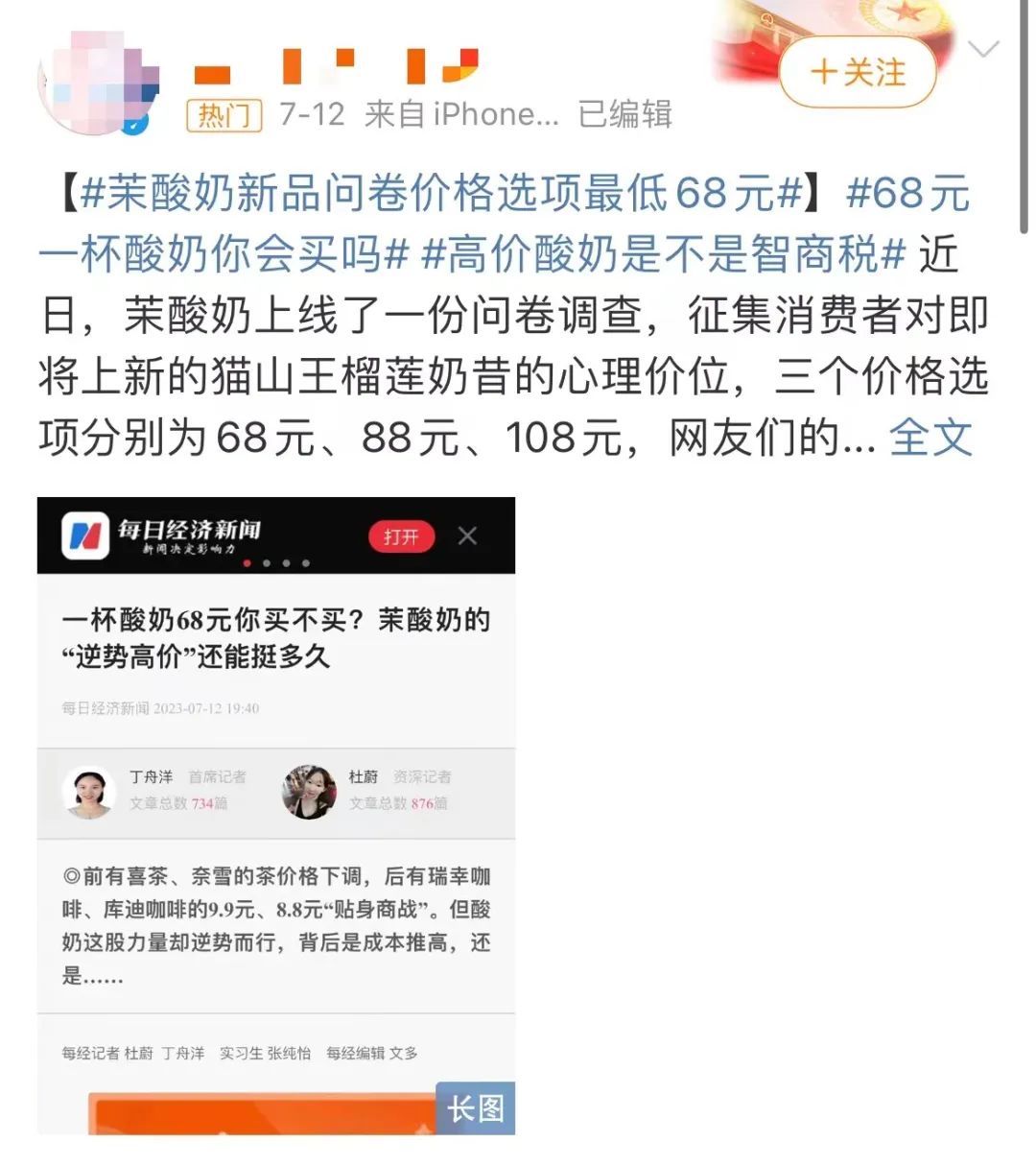 比如前幾天,茉酸奶因為貓山王酸奶最低68元,最高128元,僅僅讓網(wǎng)友做價格投票,就被推上風口浪尖。