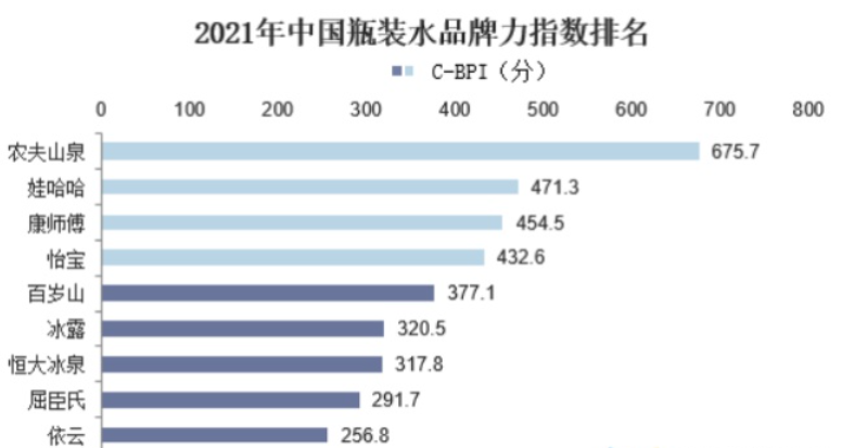 據(jù)《2021年中國瓶裝水品牌力指數(shù)排名》可知,怡寶的品牌力得分遠(yuǎn)遠(yuǎn)落后于農(nóng)夫山泉,甚至還被市占率不及它的娃哈哈和康師傅超越,僅排名第四。