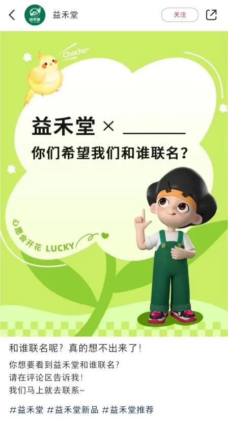 可預(yù)見的是,聯(lián)名依舊是各個茶飲品牌接下來發(fā)力的重點。下半年剛開啟,各個品牌就已經(jīng)躍躍欲試,已推出或者準(zhǔn)備推出聯(lián)名款了。除了喜茶和奈雪的茶,茶百道在7月9日正式上線了與《未定事件簿》的聯(lián)名新品與周邊,同日,蜜雪冰城也官宣了與《蛋仔派對》的聯(lián)名合作。而且,益禾堂也在7月13日發(fā)布了“你們希望我們和誰聯(lián)名?”的話題。