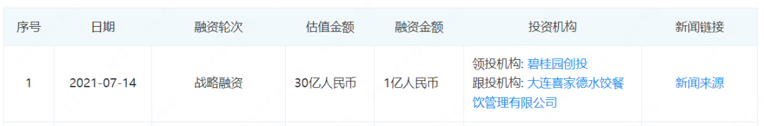 企查查顯示,遇見(jiàn)小面最近一輪融資在2021年,投資機(jī)構(gòu)為碧桂園創(chuàng)投、大連喜家德水餃餐飲管理有限公司,融資金額為1億元。