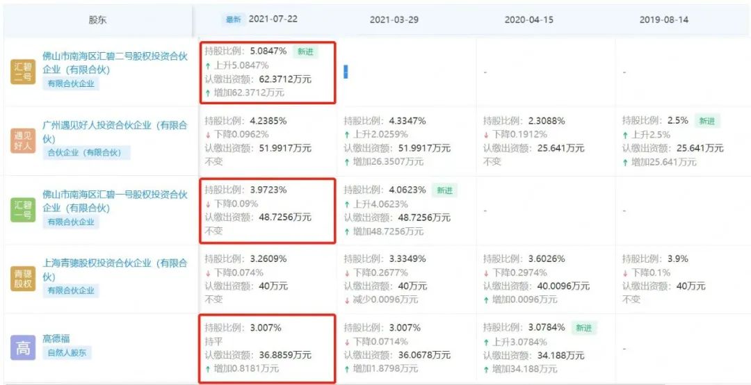 但從股東認(rèn)繳信息來(lái)看,截至2021年7月22日,匯碧一號(hào)、匯碧二號(hào)、高德福幾大股東分別增加了0元、62.3712萬(wàn)元、0.8181萬(wàn)元投資額,總計(jì)為63.1893萬(wàn)元。