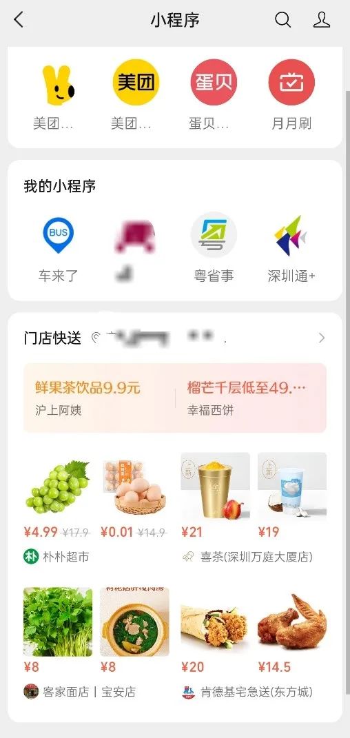 除了抖音,微信也加入了本地生活的競爭中。今年2月,微信在廣深地區(qū)的小程序入口上線了“門店快送”業(yè)務,聚合具備外送服務能力的商家,向用戶和商家開放新的外送服務入口。
