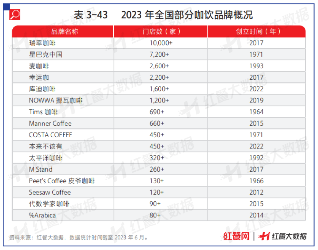 具體來看,國內(nèi)門店數(shù)最多的咖飲品牌是瑞幸咖啡。瑞幸咖啡差異化地瞄準了消費者對于便捷、高性價比的消費需求,通過“小店模式”快速鋪設(shè)大量門店。據(jù)紅餐大數(shù)據(jù),截至2023年6月,瑞幸咖啡的門店數(shù)超過10,000家,進駐城市超過240個,已經(jīng)遠超星巴克在國內(nèi)的總門店數(shù)。