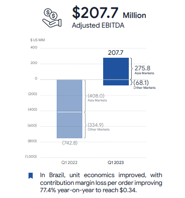 根據(jù)Shopee母公司Sea的財(cái)報(bào),今年一季度,Shopee 的收入達(dá)到21億美元,同比增長(zhǎng)36.3%,并且再次實(shí)現(xiàn)季度盈利,該季度經(jīng)調(diào)整EBITDA達(dá)2.077億美元,而去年同期為負(fù)7.428億美元。